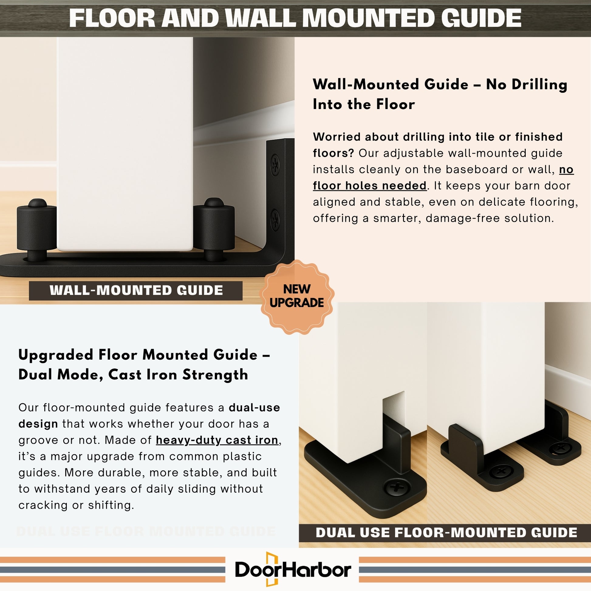 - BUILT-IN SAFETY & PROTECTIVE PACKAGING FOR PEACE OF MIND. From installation to daily use, this barn door set is designed with your safety in mind. Anti-jump pads, floor guides, and door stoppers keep the door securely on track, preventing accidents and hard slams. Plus, each door panel ships in reinforced packaging to minimize transit damage. Ensuring it arrives in perfect condition, ready for reliable and long-term performance.