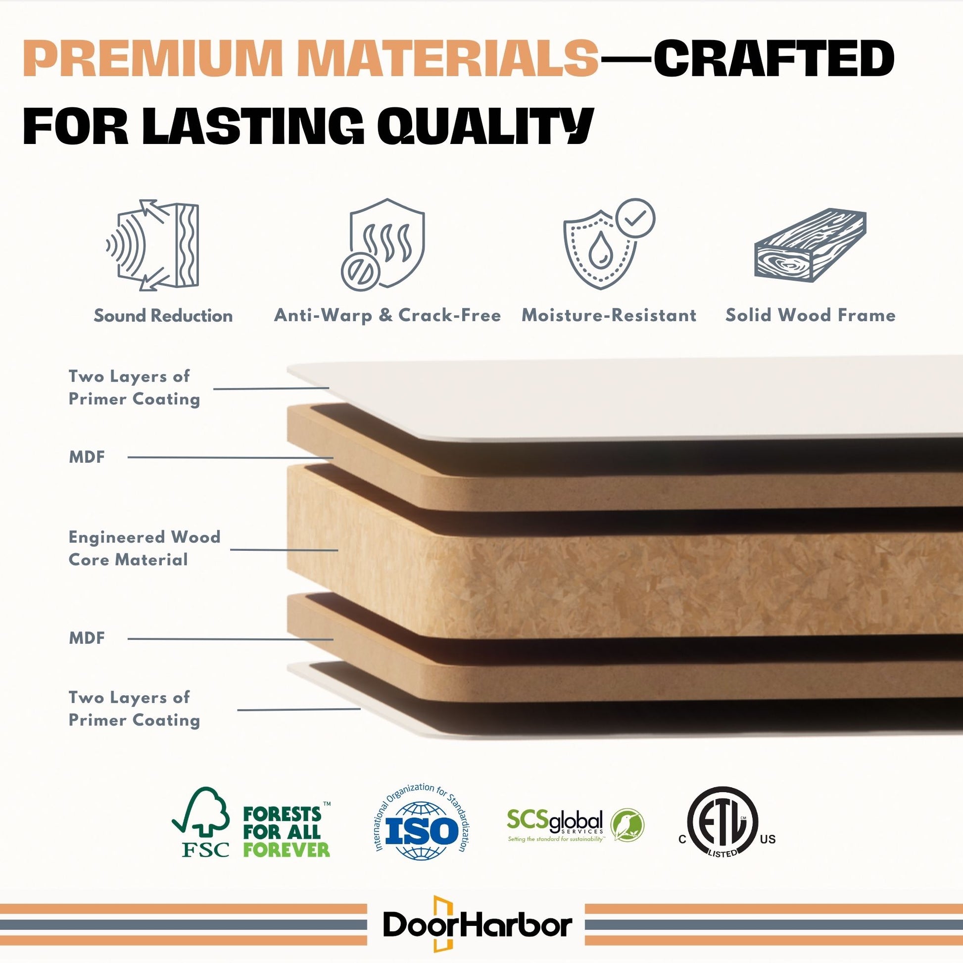 - PREMIUM MATERIALS FOR A DURABLE DOOR AND LONG-LASTING HARDWARE. Crafted from FSC & ISO certified solid core wood and industrial-grade carbon steel, this barn door set delivers professional-level quality. The door features a dense, noise-reducing core for long-term durability, while the black powder-coated hardware resists rust, wear, and heavy use.