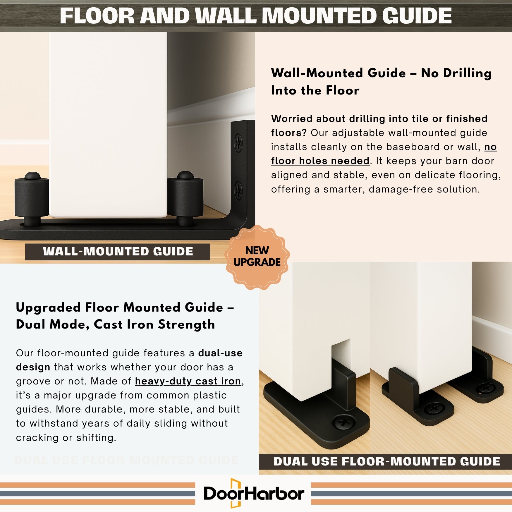 - BUILT-IN SAFETY & PROTECTIVE PACKAGING FOR PEACE OF MIND. From installation to daily use, this barn door set is designed with your safety in mind. Anti-jump pads, floor guides, and door stoppers keep the door securely on track, preventing accidents and hard slams. Plus, each door panel ships in reinforced packaging to minimize transit damage. Ensuring it arrives in perfect condition, ready for reliable and long-term performance.