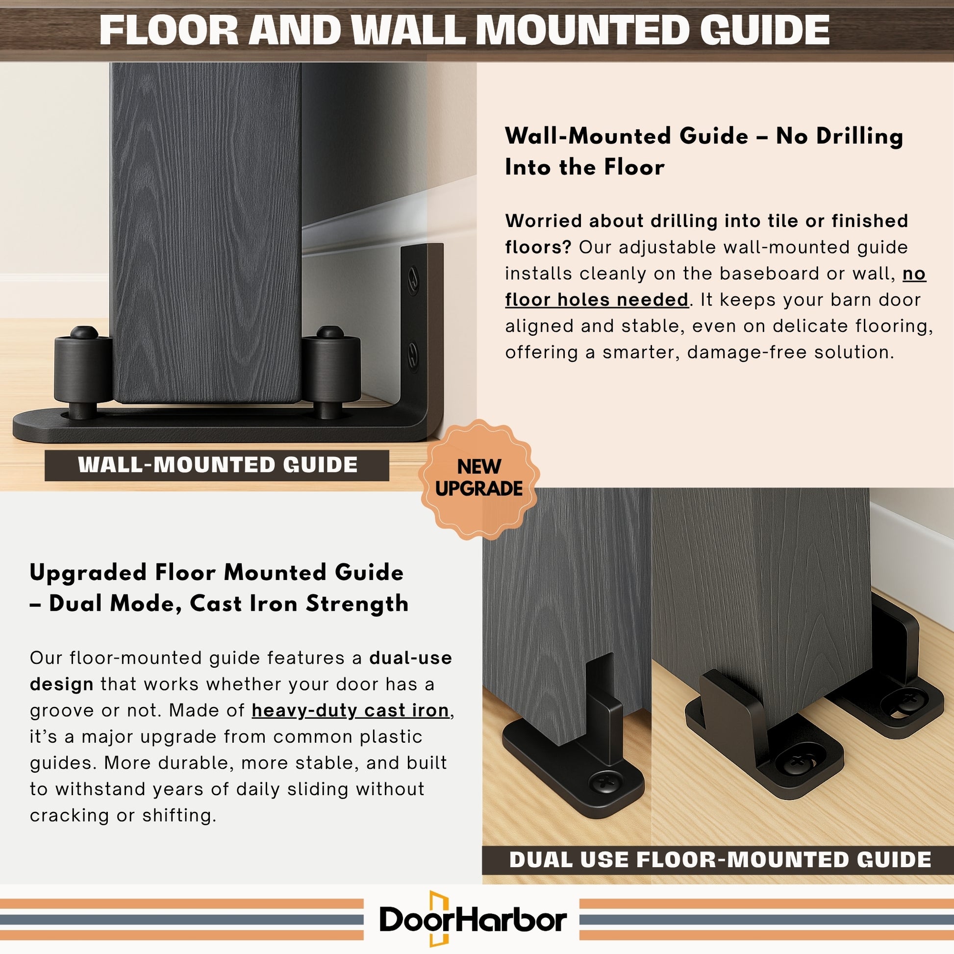 - BUILT-IN SAFETY & PROTECTIVE PACKAGING FOR PEACE OF MIND. From installation to daily use, this barn door set is designed with your safety in mind. Anti-jump pads, floor guides, and door stoppers keep the door securely on track, preventing accidents and hard slams. Plus, each door panel ships in reinforced packaging to minimize transit damage. Ensuring it arrives in perfect condition, ready for reliable and long-term performance.