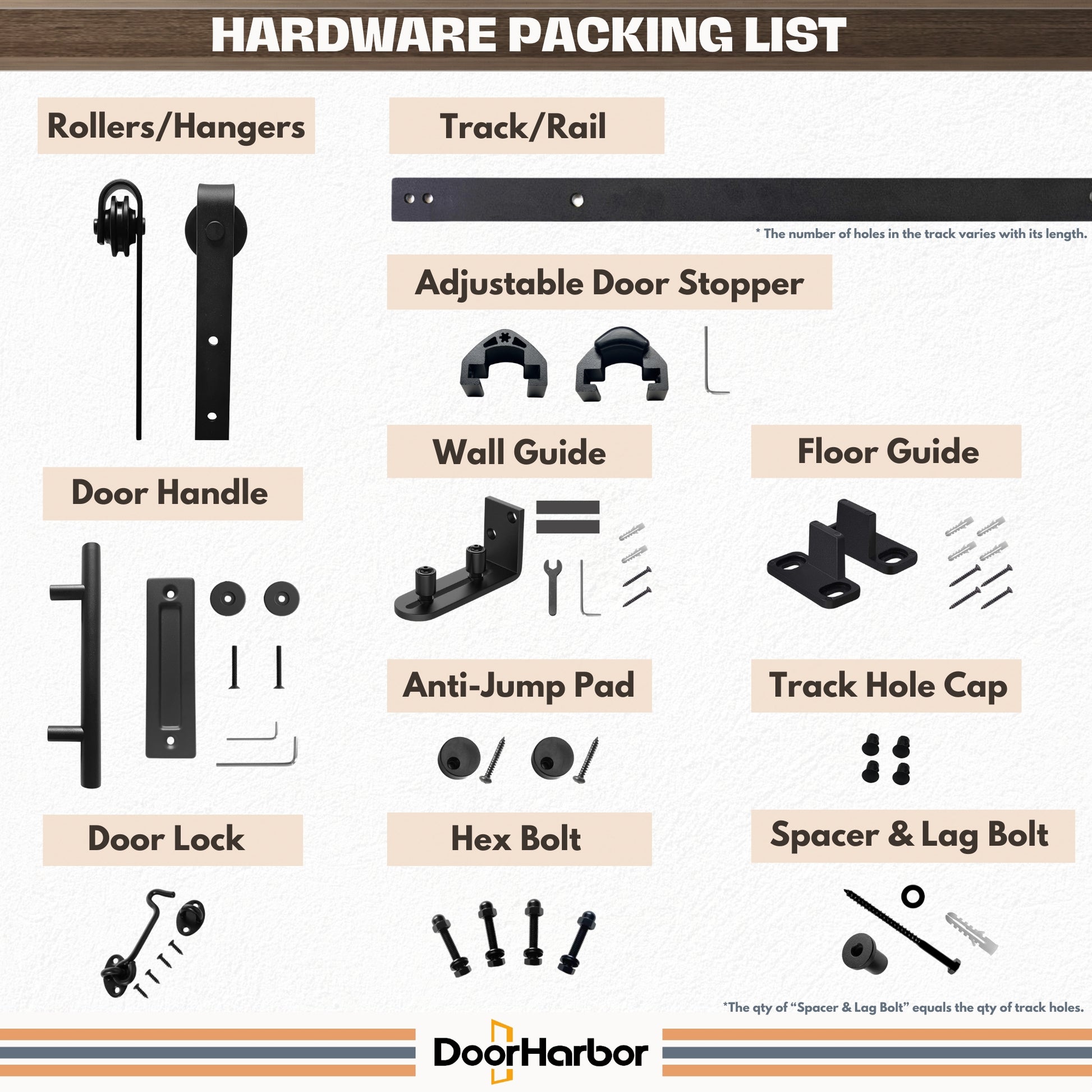 - ALL-IN-ONE DOOR & HARDWARE KIT, NO EXTRA SHOPPING NEEDED. This complete package comes with a primed interior door, heavy-duty track, smooth-glide rollers, double-sided handle, lock, floor and wall guides, and all required hardware. No need to buy extra components, save time and ensure a seamless installation with everything pre-matched and ready to go.