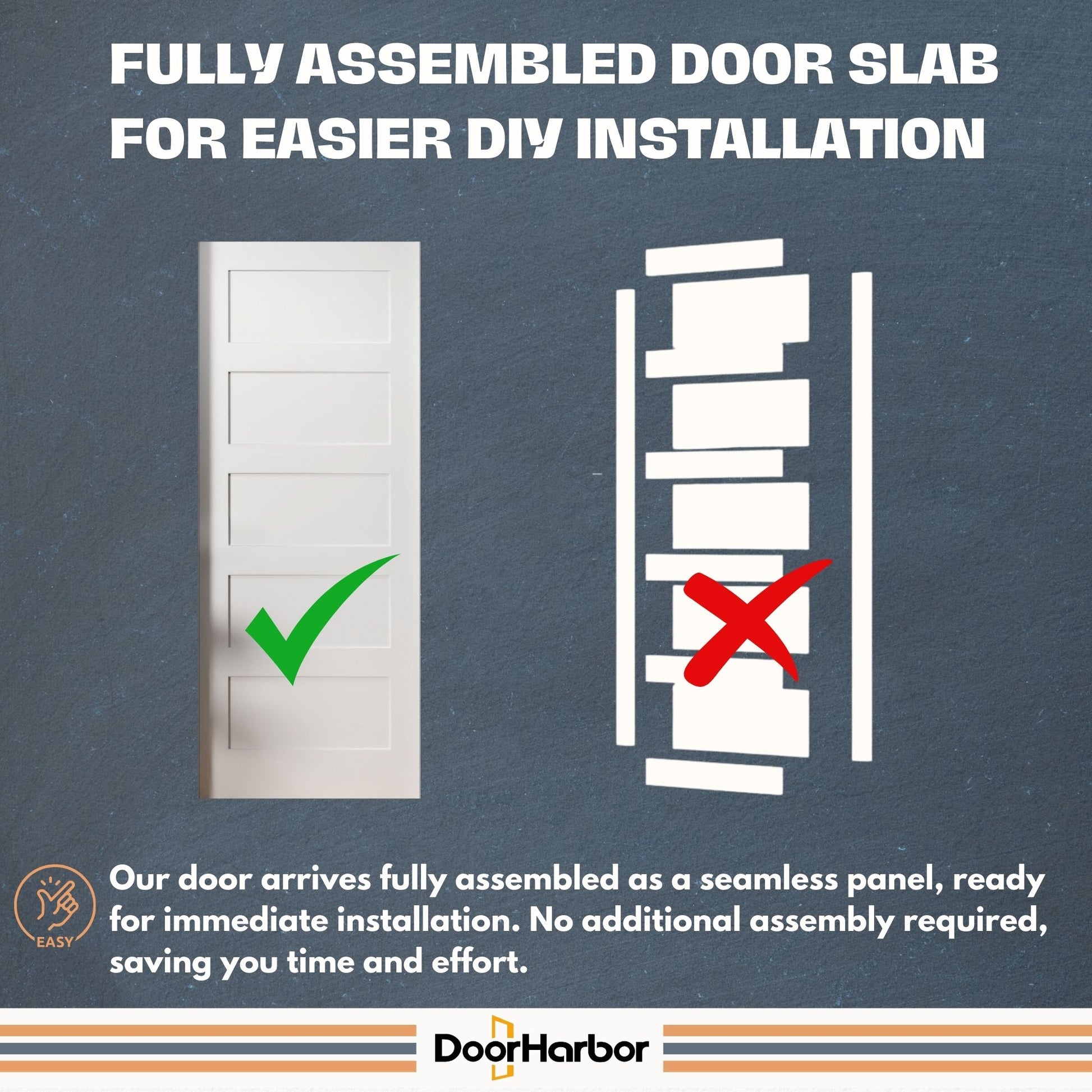 Pre-Assembled Sliding Barn Door with ALL-IN-ONE Black Hardware Kit, 5-Panel Shaker Design, Solid Core, White Primed, with One-Piece Track, Includes Handle and Lock